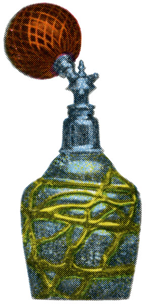 Zerstäuber mit vernickelten oder vergoldeten Montierungen und roten Gummibällen. Flacons in Farben sortiert und decoriert. Preise per Dutzend.