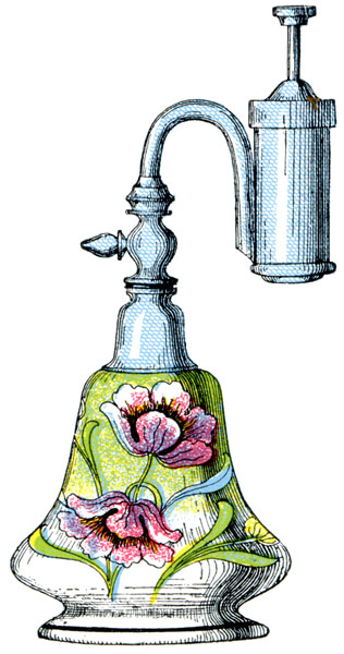 Perfum-Sprays with metal pumps made of Brass nickle-plated or gold-plated. Bottles in assorted colours, cut and decorated. Prices per dozen.
